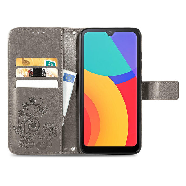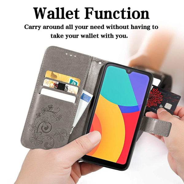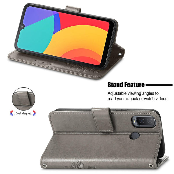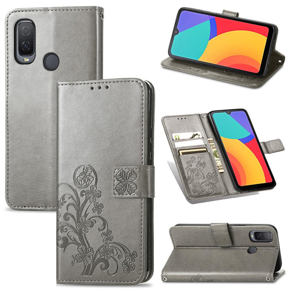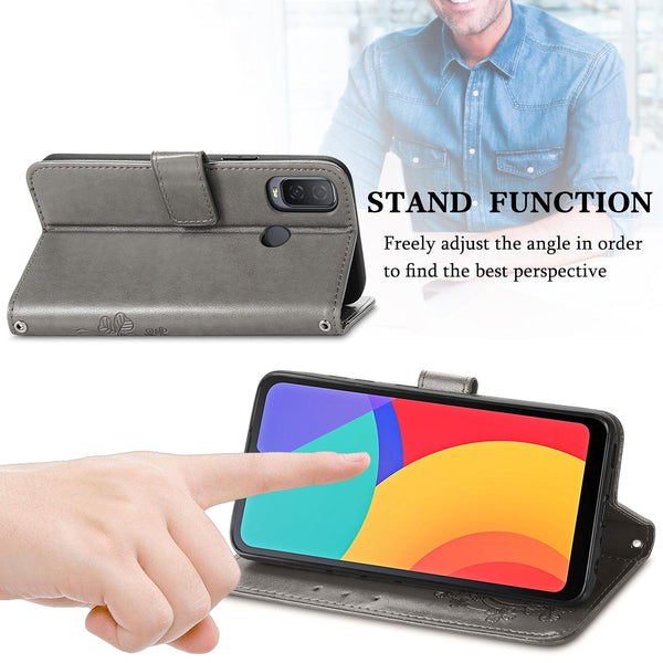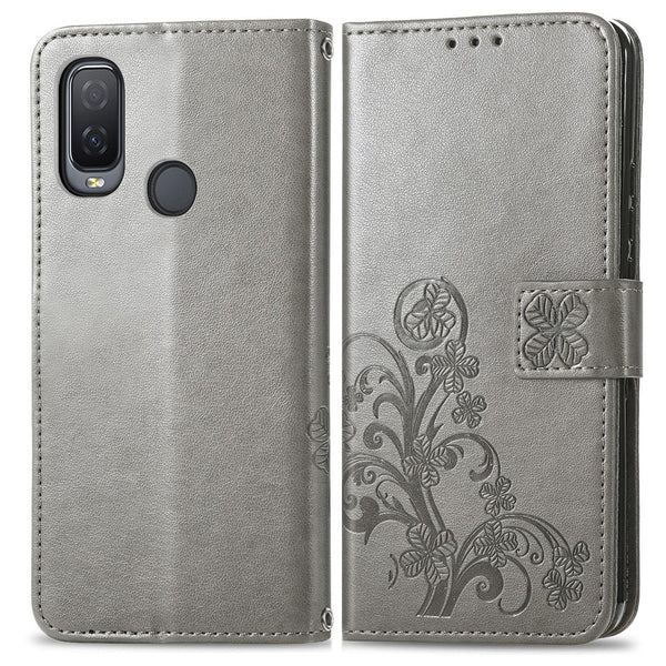 For Alcatel 1L 2021 Four-leaf Clasp Embossed Buckle Mobile Phone Protection Leather Case with Lanyard & Card Slot & Wallet & Bracket Function(Gray)