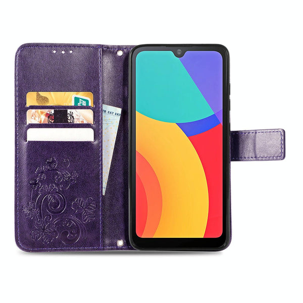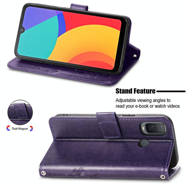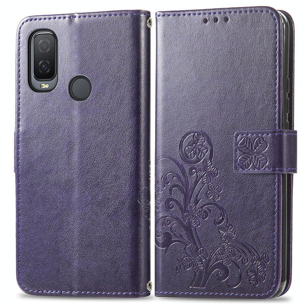 For Alcatel 1L 2021 Four-leaf Clasp Embossed Buckle Mobile Phone Protection Leather Case with Lanyard & Card Slot & Wallet & Bracket Function(Purple)