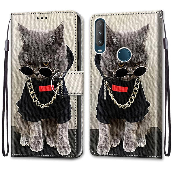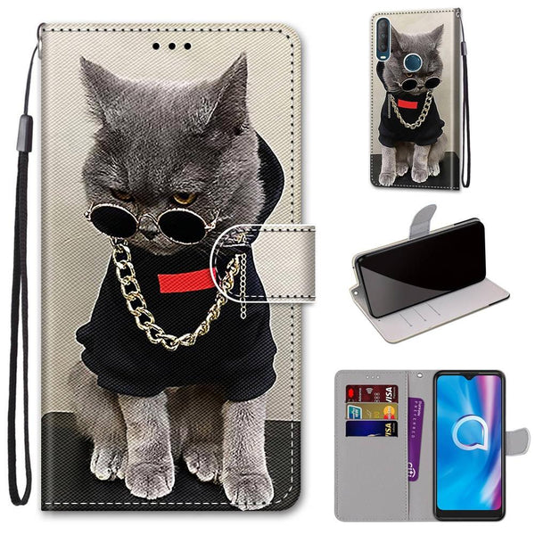 For Alcatel 1S (2020) / 3L (2020) Coloured Drawing Cross Texture Horizontal Flip PU Leather Case with Holder & Card Slots & Wallet & Lanyard(Golden Chain Grey Cat)