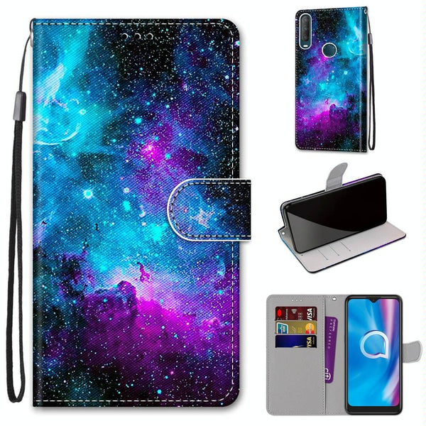 For Alcatel 1S (2020) / 3L (2020) Coloured Drawing Cross Texture Horizontal Flip PU Leather Case with Holder & Card Slots & Wallet & Lanyard(Purple Green Starry Sky)
