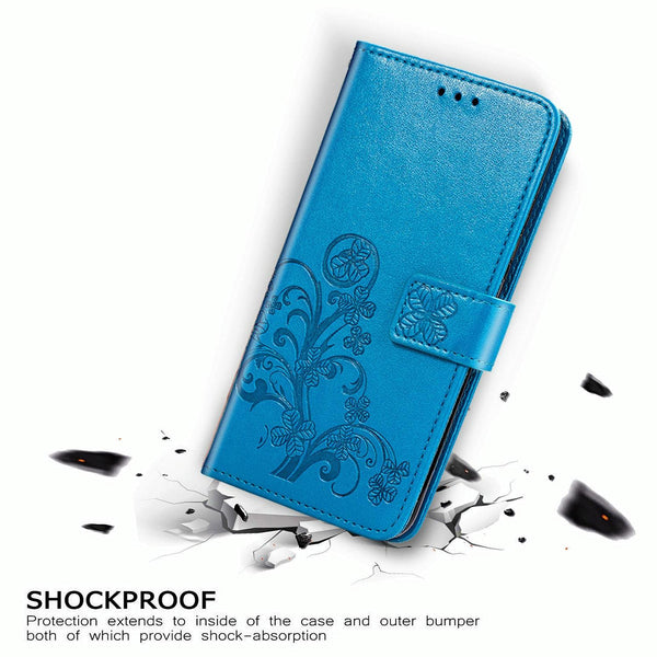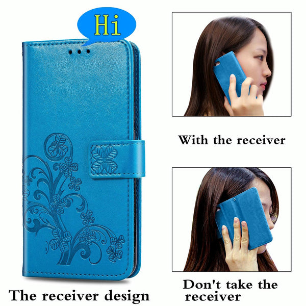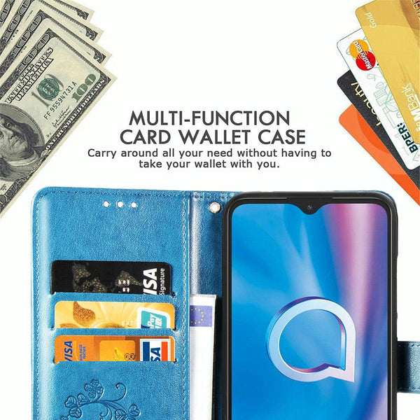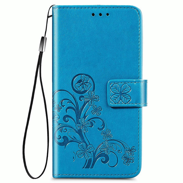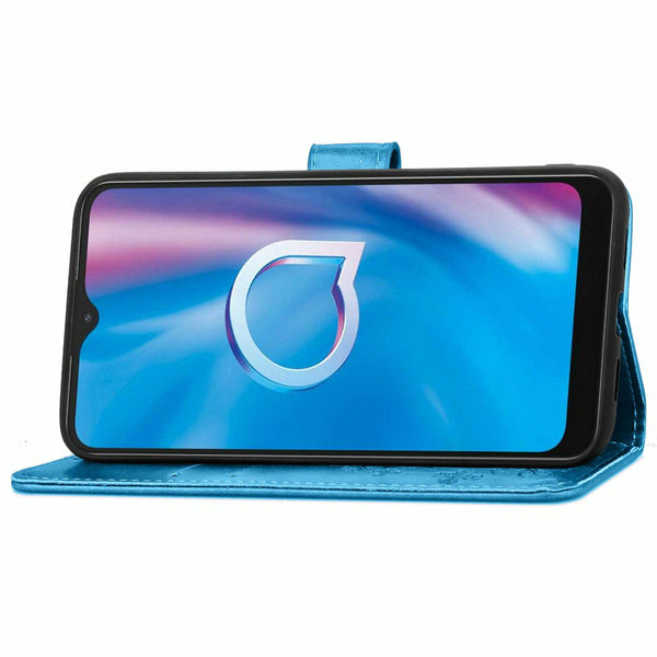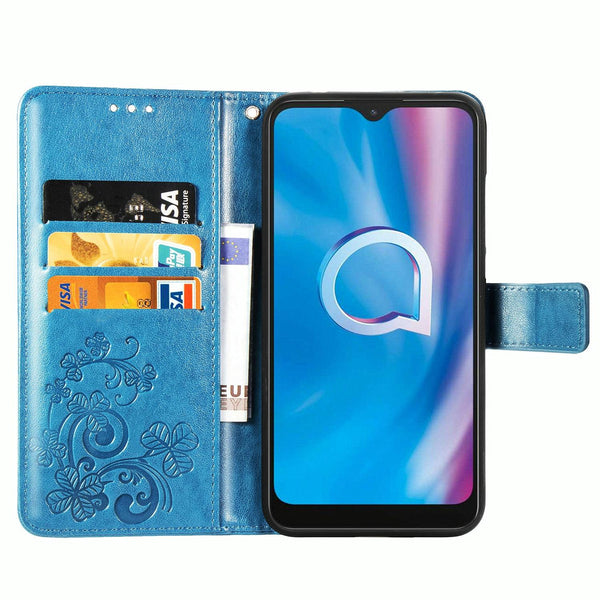 ForAlcatel 1S (2020) Four-leaf Clasp Embossed Buckle Mobile Phone Protection Leather Case with Lanyard & Card Slot & Wallet & Holder Function(Blue)