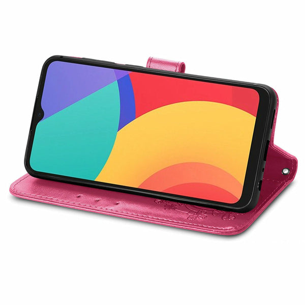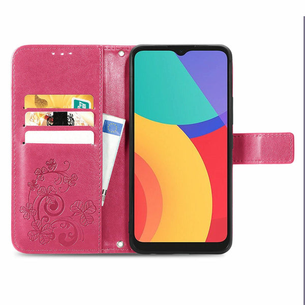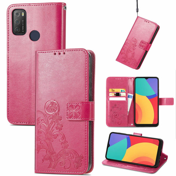 For Alcatel 1S 2021 Four-leaf Clasp Embossed Buckle Mobile Phone Protection Leather Case with Lanyard & Card Slot & Wallet & Bracket Function(Magenta)