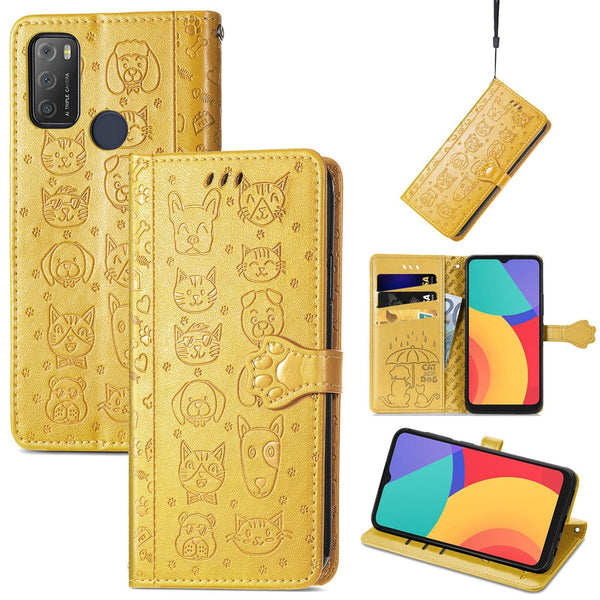 For Alcatel 1S 2021 Lovely Cat and Dog Embossing Pattern Horizontal Flip Leather Case , with Holder & Card Slots & Wallet & Cartoon Clasp & Lanyard(Yellow)