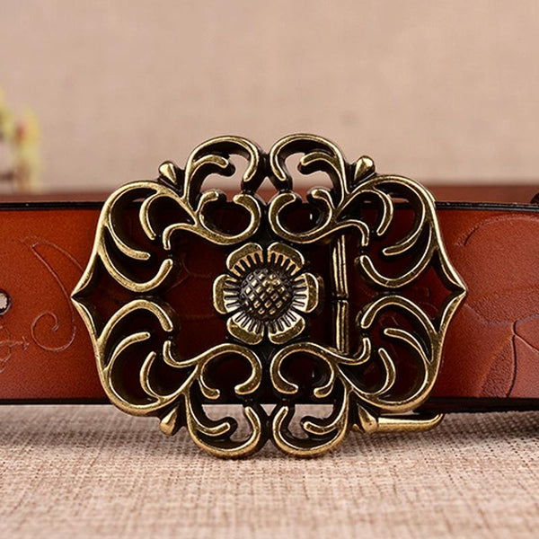 105cm Sunflower Pattern Needle Buckle Women Belt Retro Waist Band Leather Belt(Black)