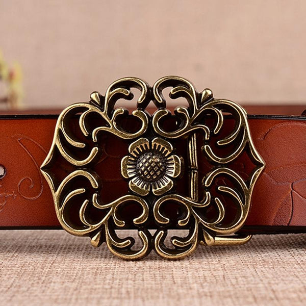 110cm Sunflower Pattern Needle Buckle Women Belt Retro Waist Band Leather Belt(Brown)