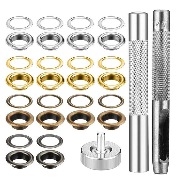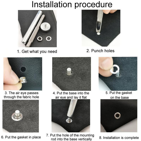 Contents: eye buckles + 3 tools (punch + mounting rod + base) + storage box