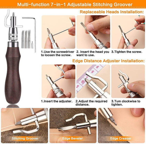 1. All-in-one Leatherworking Tool Kit -- for stamping, sewing, engraving, decorative gluing, edging coloring and other functions for leather crafting.