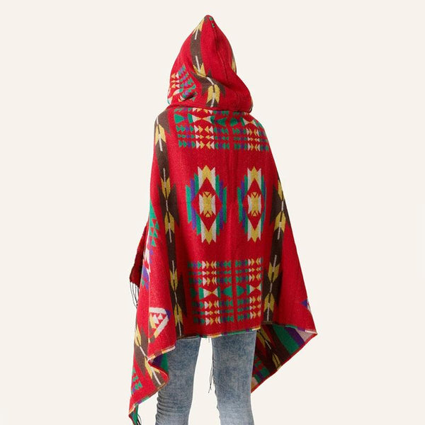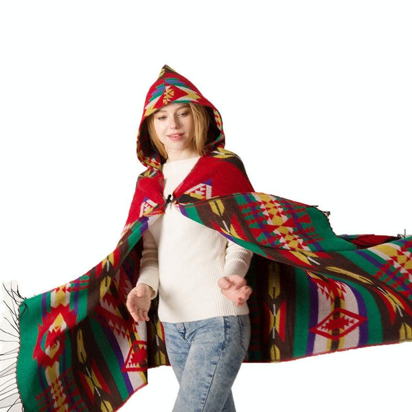 Autumn And Winter Horn Buckle Ethnic Style Hooded Cloak Shawl Bohemian Hooded Shawl, Size:135-175cm(B Style Rose Red)