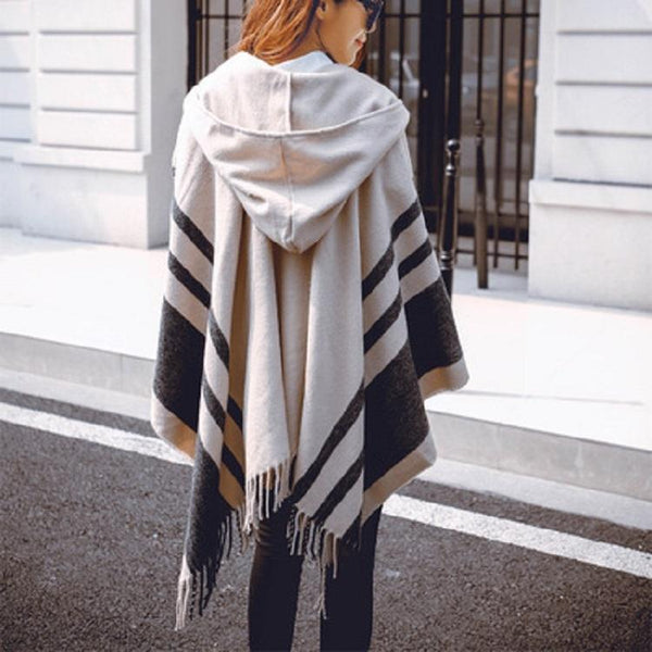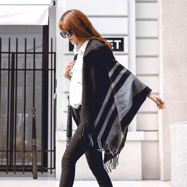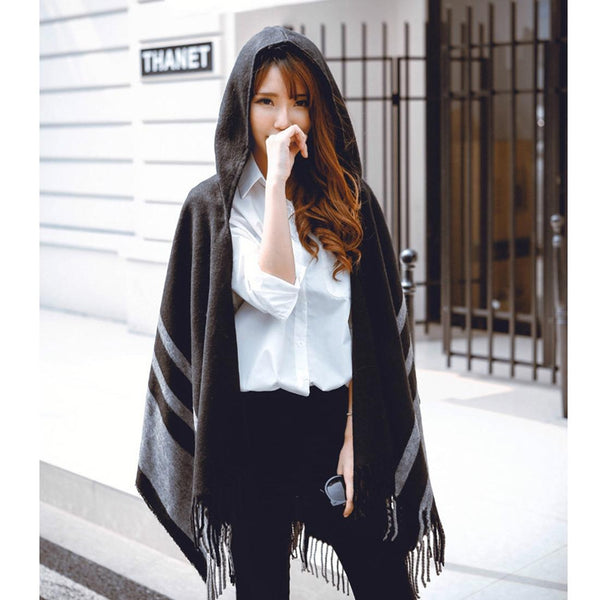 Autumn and Winter Ladies Hooded Warm Thick Tassel Cloak Shawl Scarf Dual-use, Width:65cm(Black)