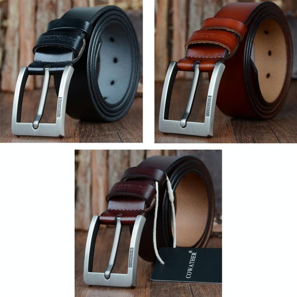 COWATHER XF004 Men Two-Layer Cowhide Business Casual Pin Buckle Belt, Length (cm): 100cm(Silver Buckle Brown)