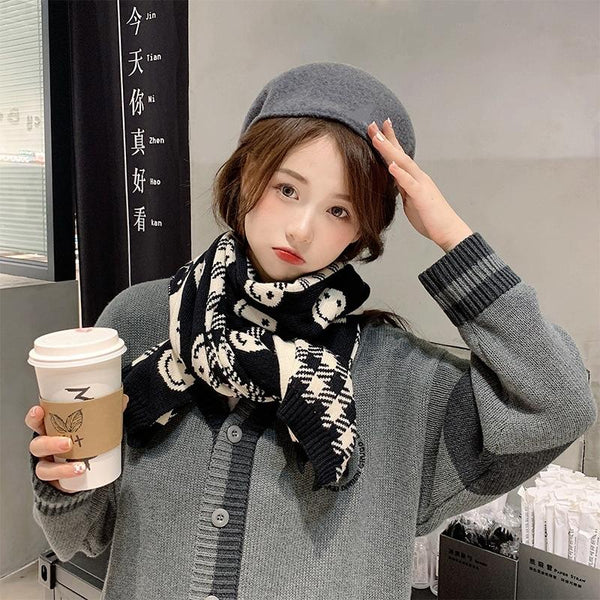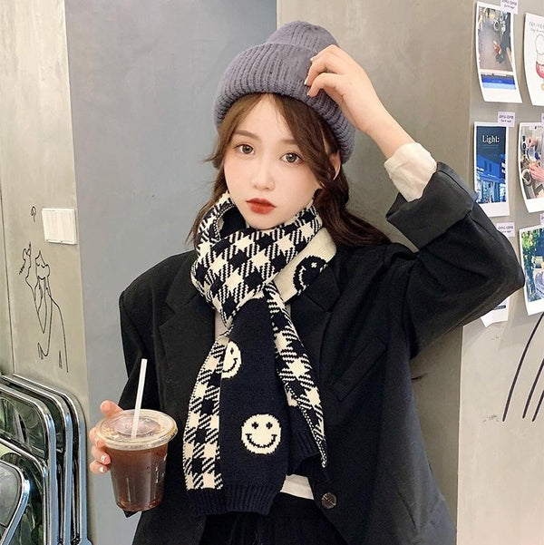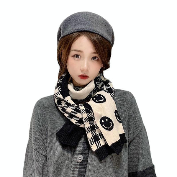 Double-Sided Cute Smiling Face Wool Scarf Women Autumn And Winter All-Match Thick Warm Knitted Bib, Length (cm): 190cm(Black)