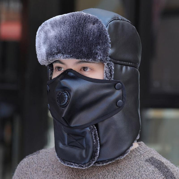 Leather Lei Feng Hat Winter Warm Ear Protection Cotton Cap, Style: Without Lens Black