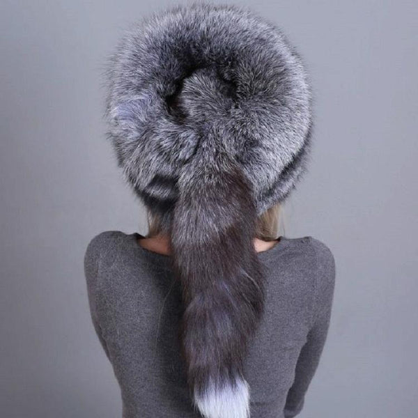 Silver Fox Ladies Winter Thick Warm Fox Fur Bomber Hat with Tail, Size:52-60cm