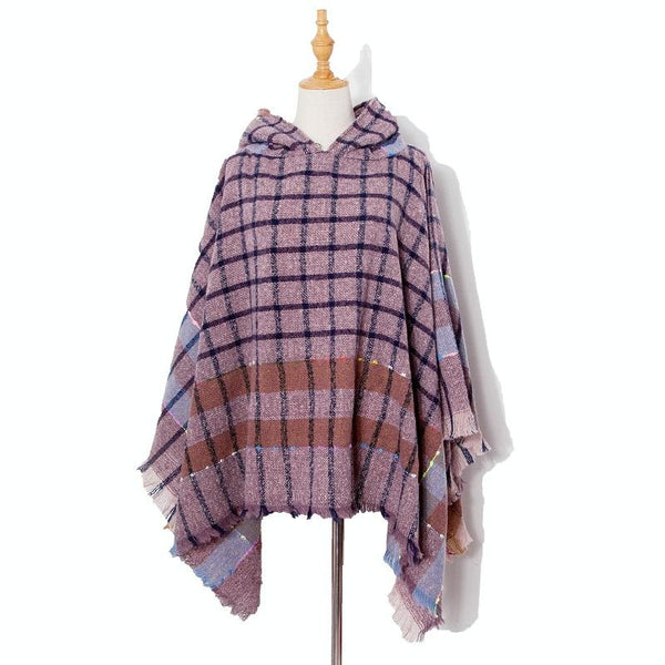 Spring Autumn Winter Checkered Pattern Hooded Cloak Shawl Scarf, Length (CM): 135cm(DP2-08 Purple)
