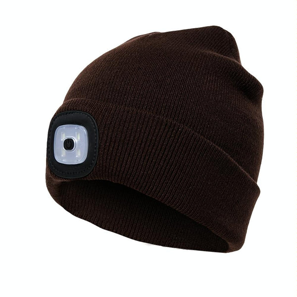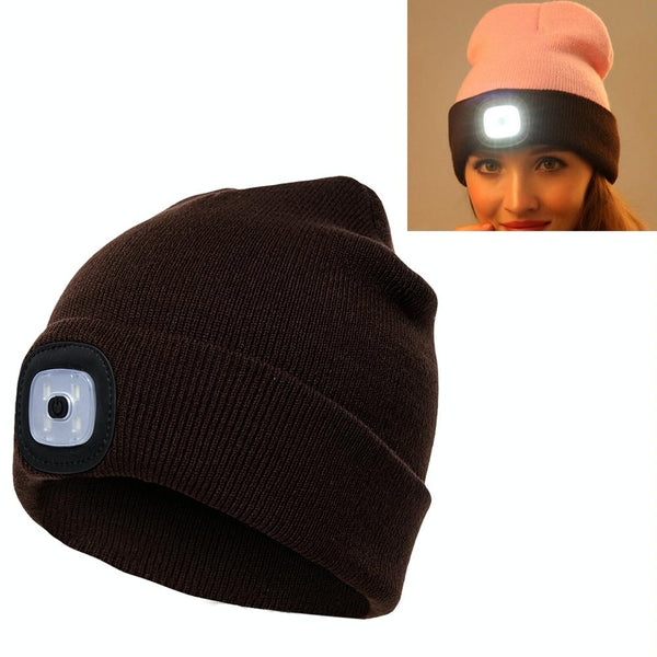 Unisex Warm Winter Polyacrylonitrile Knit Hat Adult Head Cap with 4 LED Lights, Button Battery (Coffee)