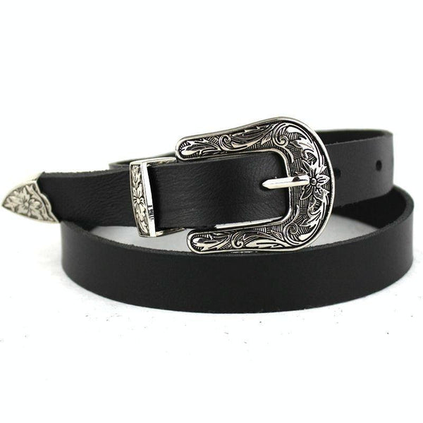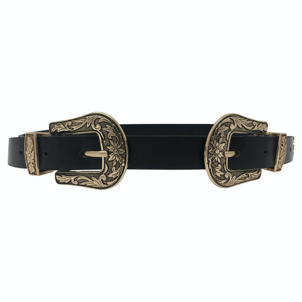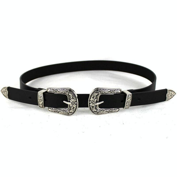 Women Black Leather Western Cowgirl Waist Metal Buckle Waistband New Hot Silver double buckle black bottom