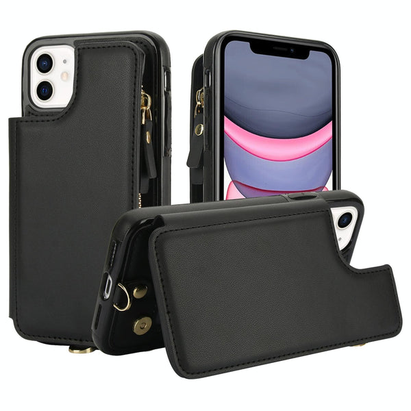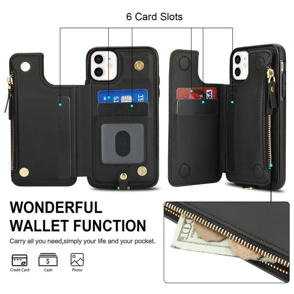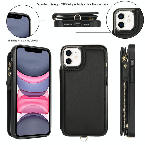 For iPhone 11 Double Flap Zipper RFID Leather Phone Case with Short Lanyard(Black)