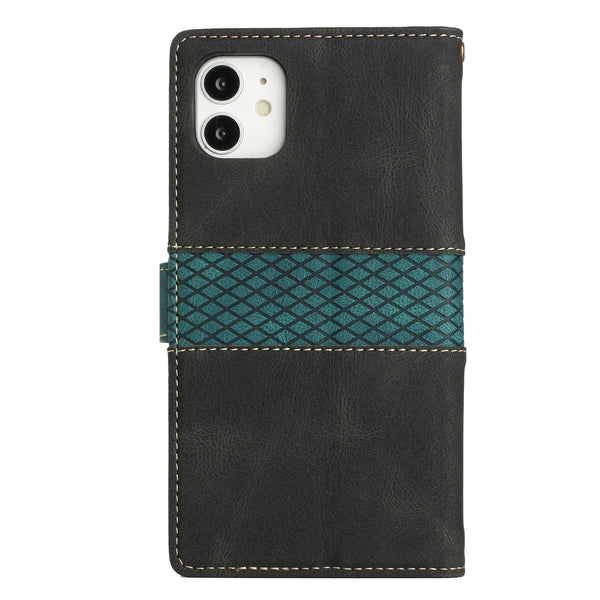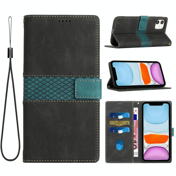 For iPhone 11 Grid Stitching Leather Phone Case with Lanyard(Black)