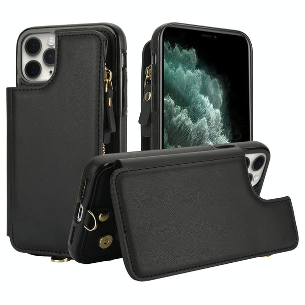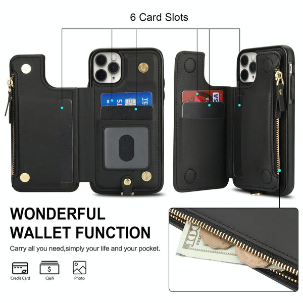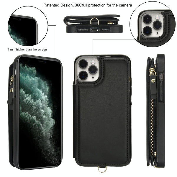 For iPhone 11 Pro Double Flap Zipper RFID Leather Phone Case with Short Lanyard(Black)