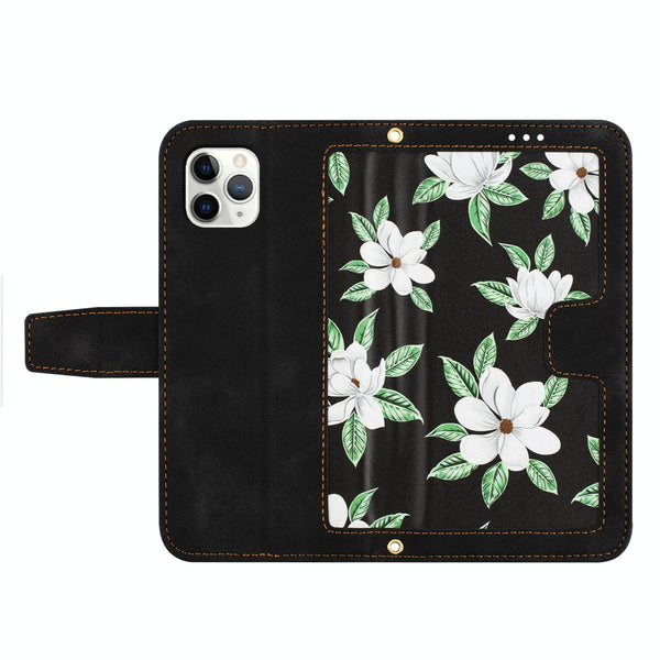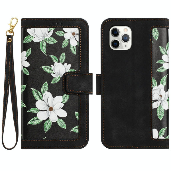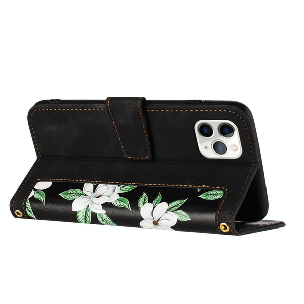 For iPhone 11 Pro Floral Pattern Leather Phone Case with Lanyard(Black)