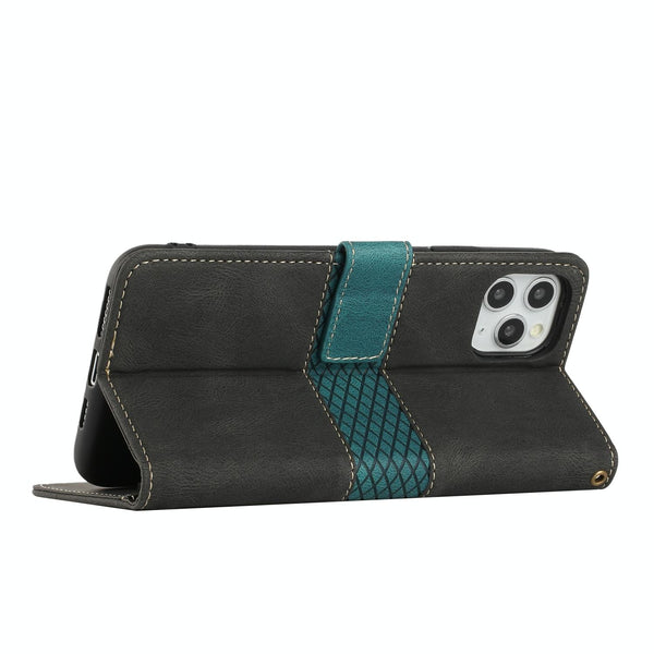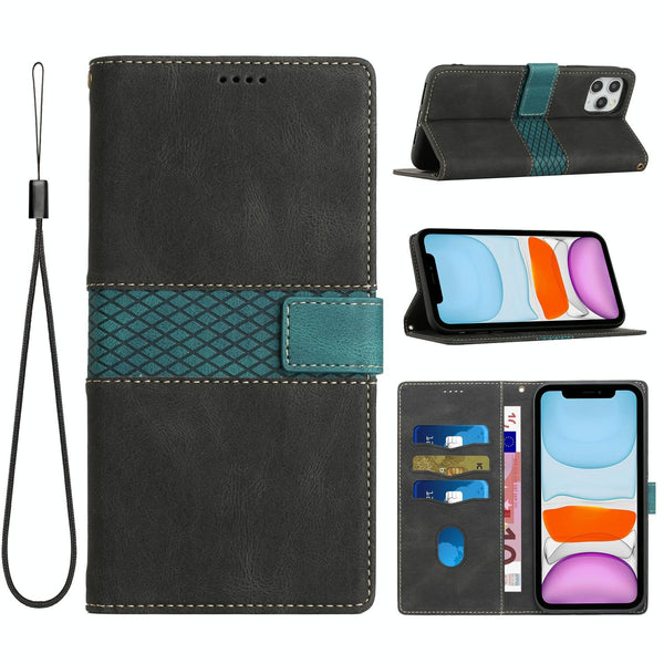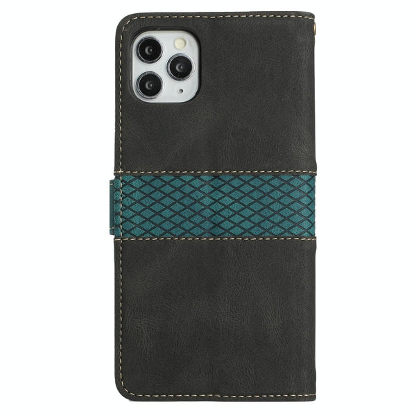 For iPhone 11 Pro Max Grid Stitching Leather Phone Case with Lanyard(Black)