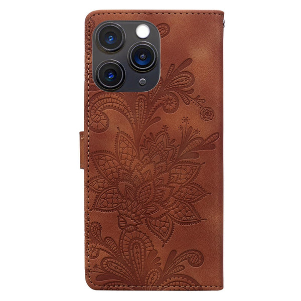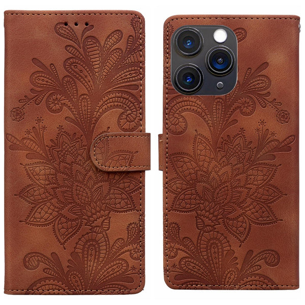 For iPhone 11 Pro Max Lace Floral Embossed Magnetic Buckle Leather Phone Case(Brown)