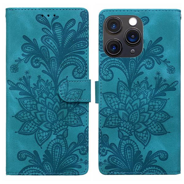 For iPhone 11 Pro Max Lace Floral Embossed Magnetic Buckle Leather Phone Case(Green)