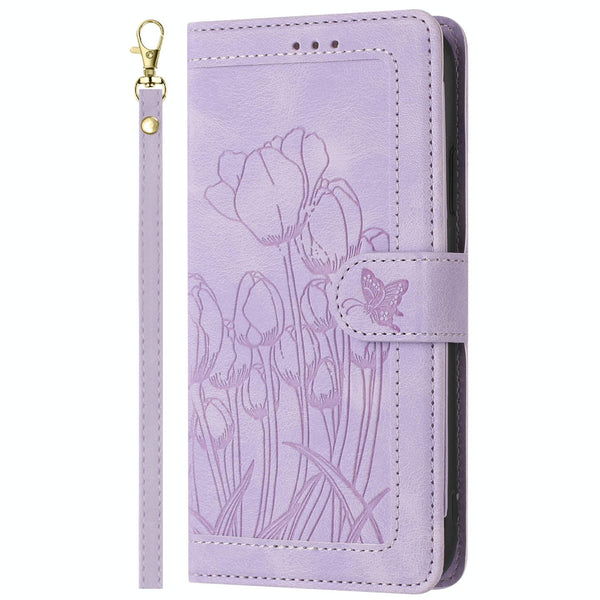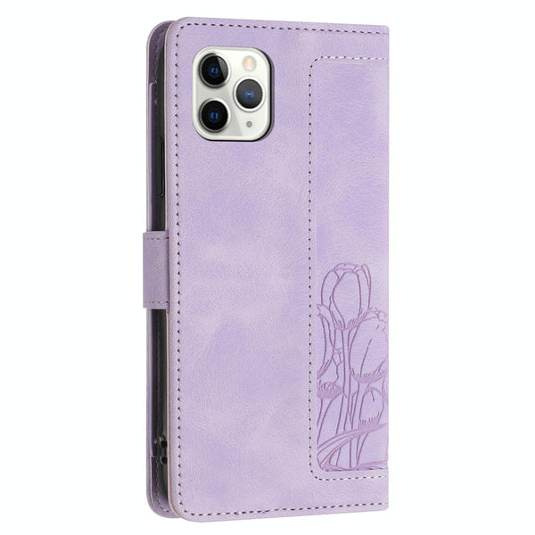 For iPhone 11 Pro Max Tulips Embossed Leather Phone Case with Lanyard(Purple)