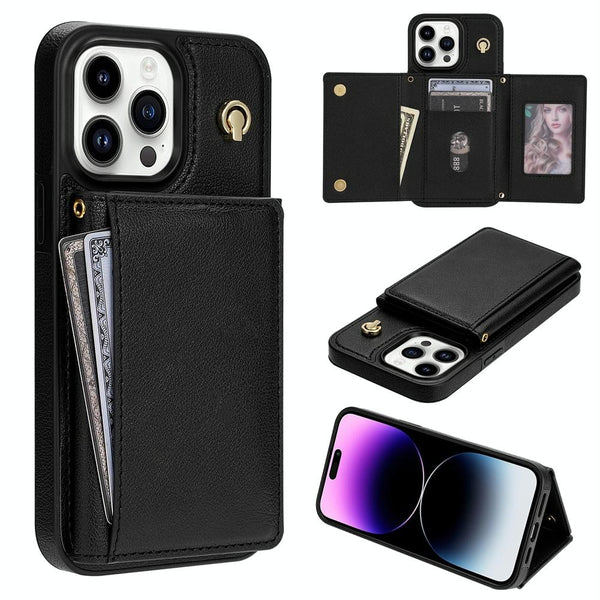 For iPhone 11 Pro Three Fold Card Bag Phone Case with Long Lanyard(Black)