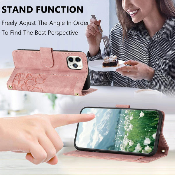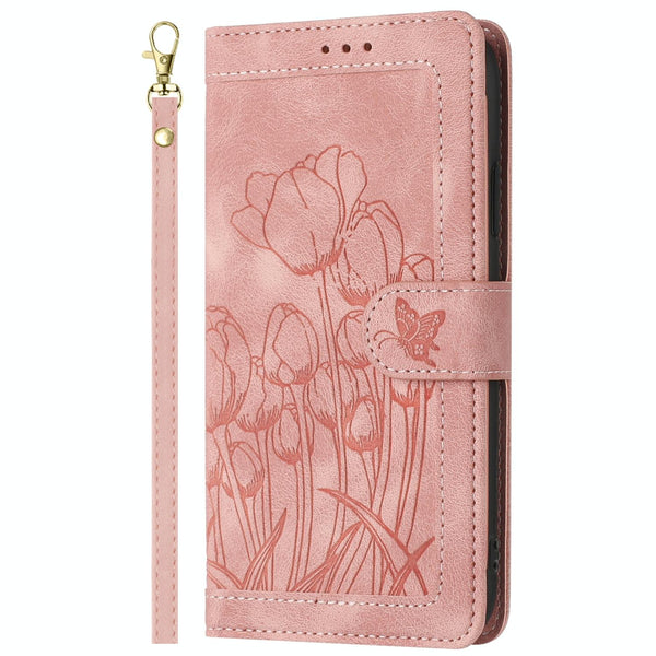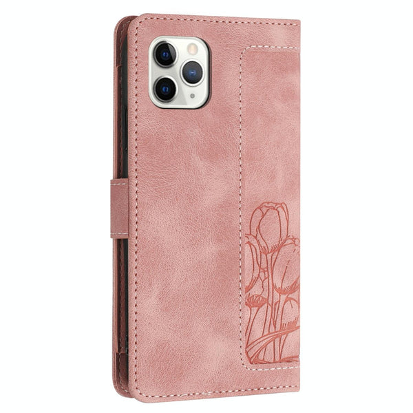 For iPhone 11 Pro Tulips Embossed Leather Phone Case with Lanyard(Pink)