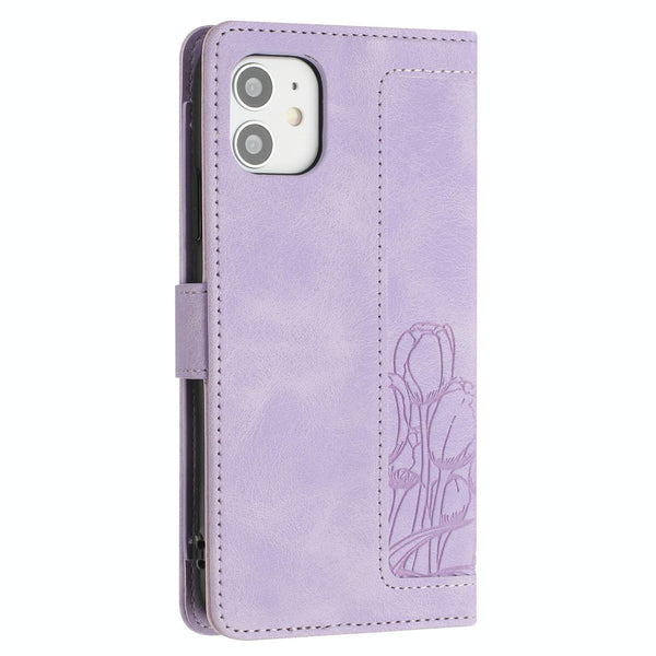 For iPhone 11 Tulips Embossed Leather Phone Case with Lanyard(Purple)