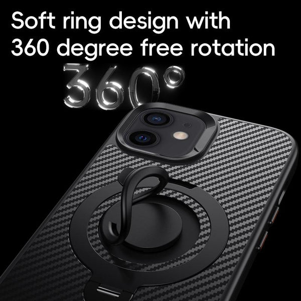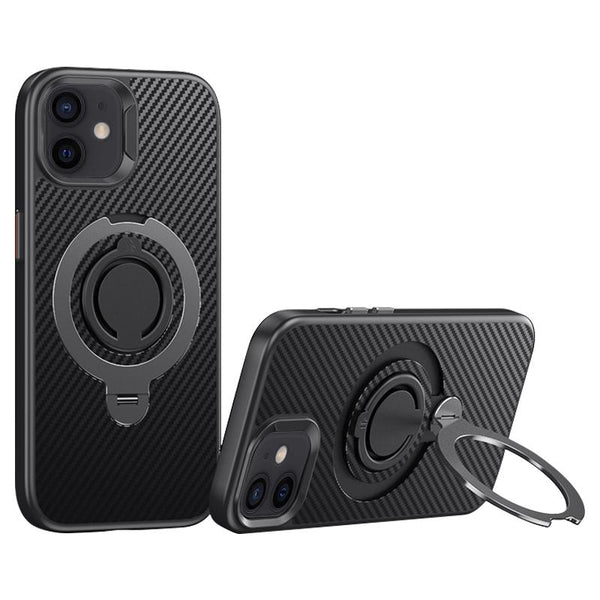 For iPhone 12 / 12 Pro Carbon Fiber MagSafe Phone Case with 360 Degree Rotating Holder(Black Grey)