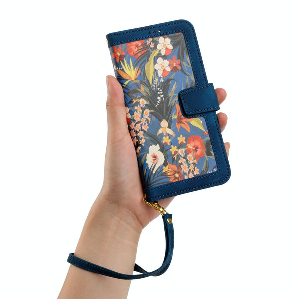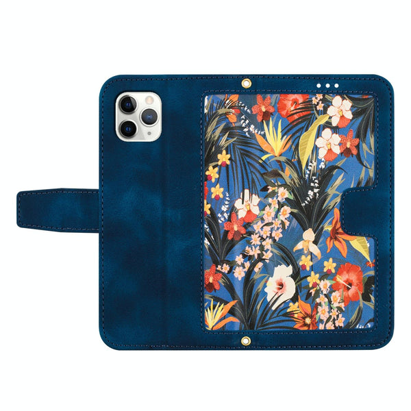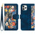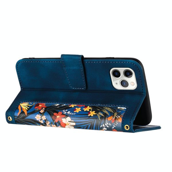 For iPhone 12 / 12 Pro Floral Pattern Leather Phone Case with Lanyard(Dark Blue)