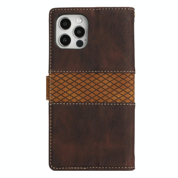 For iPhone 12 / 12 Pro Grid Stitching Leather Phone Case with Lanyard(Brown)