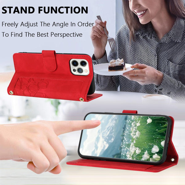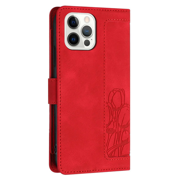 For iPhone 12 / 12 Pro Tulips Embossed Leather Phone Case with Lanyard(Red)
