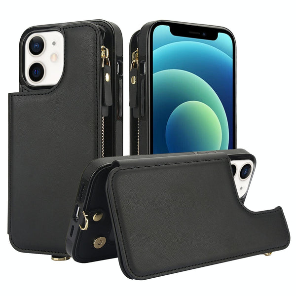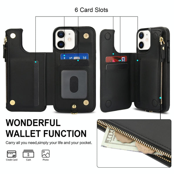 For iPhone 12 Double Flap Zipper RFID Leather Phone Case with Short Lanyard(Black)