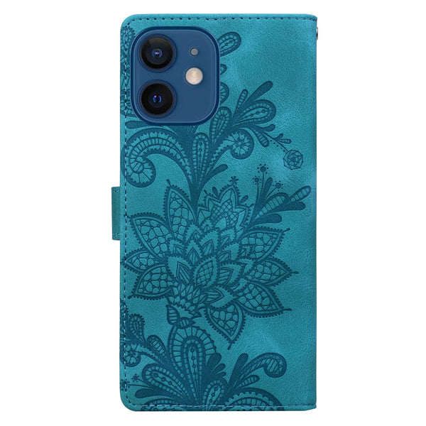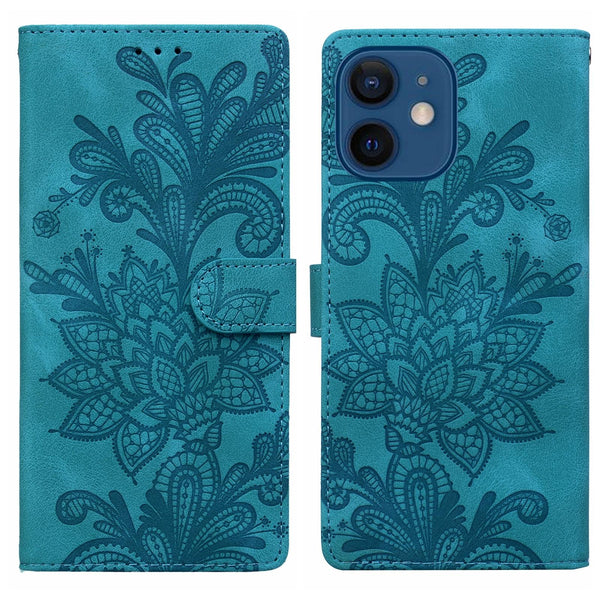For iPhone 12 Lace Floral Embossed Magnetic Buckle Leather Phone Case(Green)