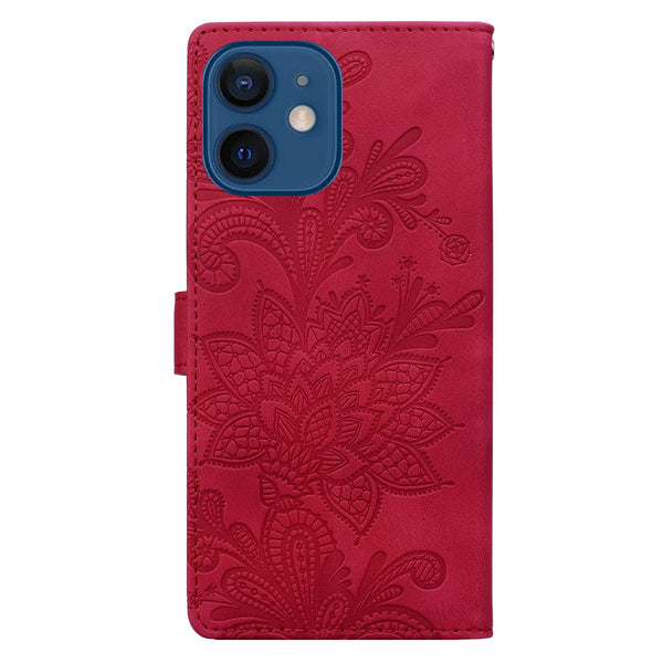 For iPhone 12 Lace Floral Embossed Magnetic Buckle Leather Phone Case(Red)