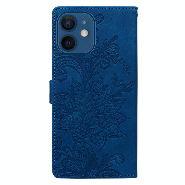 For iPhone 12 mini / 13 mini Lace Floral Embossed Magnetic Buckle Leather Phone Case(Blue)
