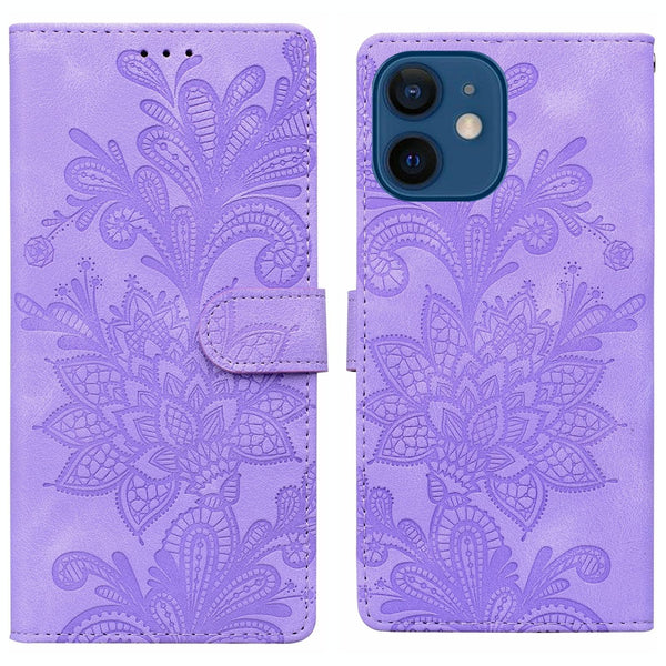 For iPhone 12 mini / 13 mini Lace Floral Embossed Magnetic Buckle Leather Phone Case(Purple)