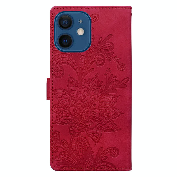For iPhone 12 mini / 13 mini Lace Floral Embossed Magnetic Buckle Leather Phone Case(Red)
