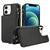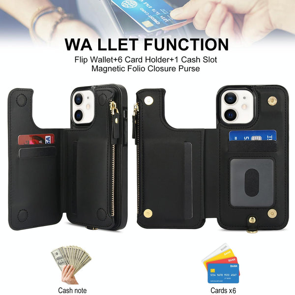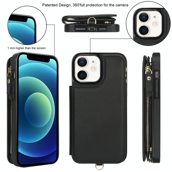 For iPhone 12 mini Double Flap Zipper RFID Leather Phone Case with Short Lanyard(Black)