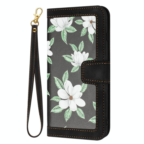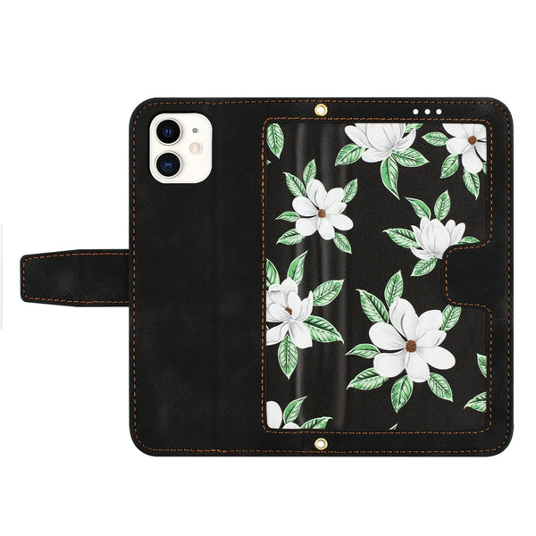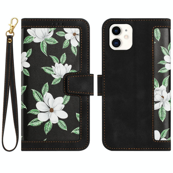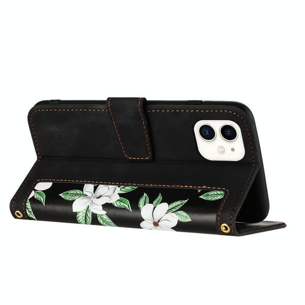 For iPhone 12 mini Floral Pattern Leather Phone Case with Lanyard(Black)