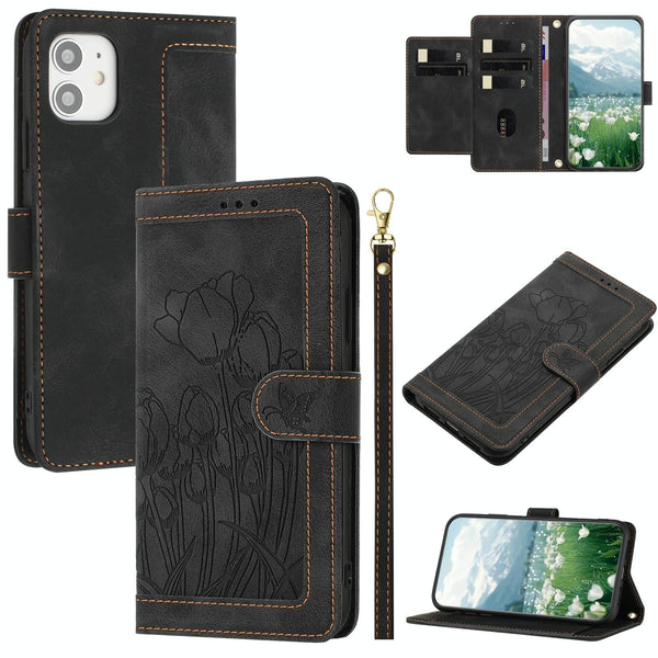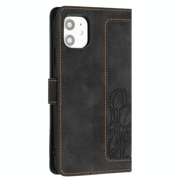 For iPhone 12 mini Tulips Embossed Leather Phone Case with Lanyard(Black)