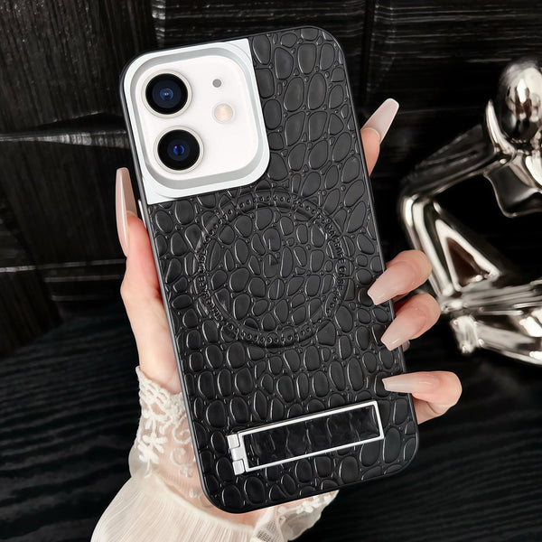 For iPhone 12 Pebble Pattern PU MagSafe Phone Case with Holder(Black)