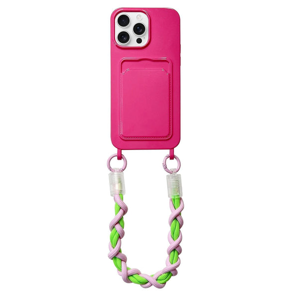 For iPhone 12 Pro Dopamine Card Slot Phone Case with Lanyard(Rose Red)