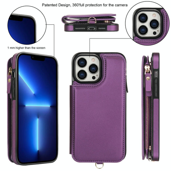 For iPhone 12 Pro Double Flap Zipper RFID Leather Phone Case with Short Lanyard(Dark Purple)