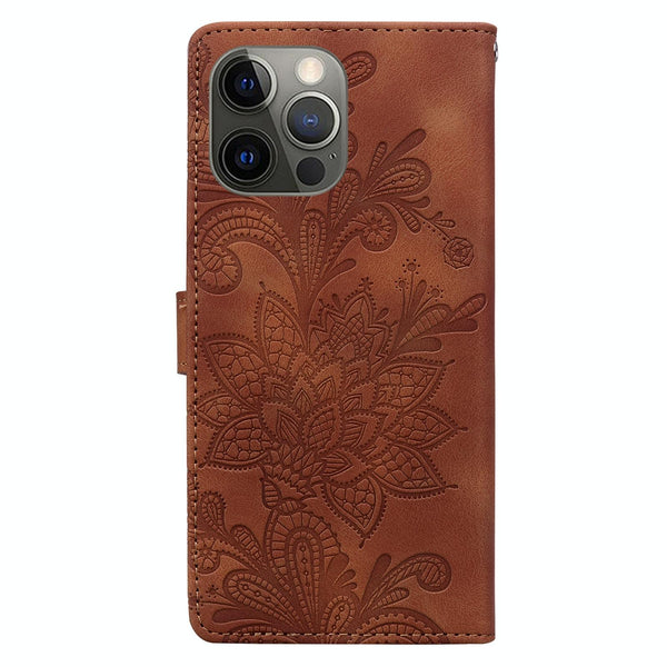 For iPhone 12 Pro Lace Floral Embossed Magnetic Buckle Leather Phone Case(Brown)
