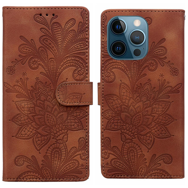 For iPhone 12 Pro Max / 13 Pro Max Lace Floral Embossed Magnetic Buckle Leather Phone Case(Brown)