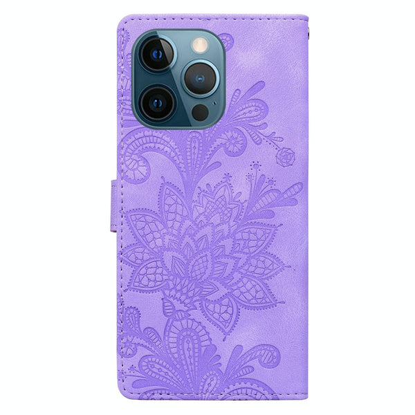 For iPhone 12 Pro Max / 13 Pro Max Lace Floral Embossed Magnetic Buckle Leather Phone Case(Purple)